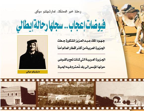 بقــــــلم : أحمد محمّد محمود * ولد الرحالة الإيطالي (مارشيللو موكي) في سينا بمقاطعة (تسكاني) عام 1910م، وحصل على الدكتوراه في الطب من جامعة روما عام 1933م، وهو في سن 23 عاماً، ثم حصل على دكتوراه في العلوم السياسية من جامعة فلورنسا، واختار السلك السياسي فدخل وزارة الخارجية عام 1939م، وفي نوفمبر من نفس العام وصل إلى جدة مبعوثاً لبلاده لدى الملك عبد العزيز يرحمه الله، فكانت هذه أولى مهامه الدبلوماسية، وكانت وفاته عام 1970م.