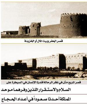 "واستبدل الملك عبدالعزيز التحصينات القديمة التي تحيط بالآبار في الحفر، والتي وصفها (فيلبي) سنة 1918م بأنه يصعب رؤيتها بقصر ضخم مزود بمحطة راديو ومستودعات طعام وذخيرة ومركز جمارك ومسجد، إضافة إلى حامية دائمة فيها جنود نظاميون للمحافظة على حدود الدولة، ولمراقبة القبائل المتحركة في منطقة الحدود الصحراوية."