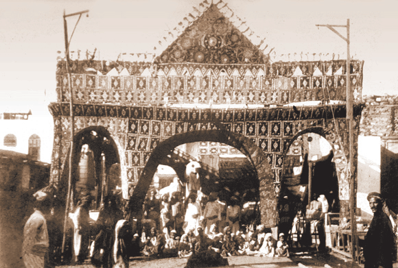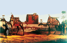 وفي صورة أخرى يظهر أحد المحامل الحقيقــية وهو معروض بمتحف الجمعية الجغرافية المصرية، وهو الصندوق الخــاص بحمل كســــوة الكعــــبة على أحد الجمال.