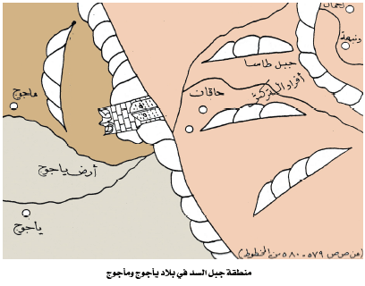 "وفي أحد الحصنين آلة البناء التي بني بها السد، من قدور الحديد ومغارف حديد، وهناك بقية من اللبن الذي التصق ببعضه بسبب الصدأ، ورئيس تلك الحصون يركب في كل يومي إثنين وخميس، وهم يتوارثون ذلك الباب كما يتوارث الخلفاء الخلافة، يقرع الباب قرعاً له دوي، والهدف منه أن يسمعه مَن وراء الباب فيعلموا أن هناك حفظة وأن الباب مازال سليماً، وعلى مصراع الباب الأيمن مكتوب {فإذا جاء وعد ربي جعله دكاء وكان وعد ربي حقاً}، والجبل من الخارج ليــــس له مـــتن ولا ســـفح، ولا عليه نبات ولا حشيش ولا غير ذلك، وهــو جبل مســطح، متســع، قـائم أملس أبيض".