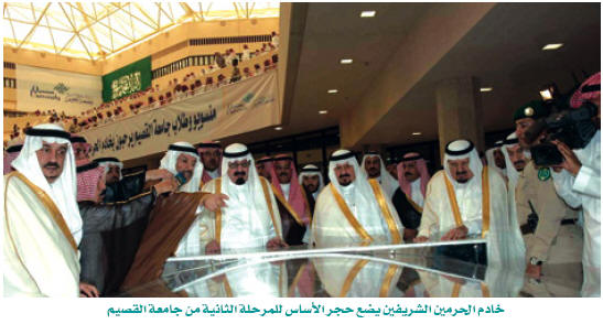 ◙ زيارة القصيم: وضع خادم الحرمين الشريفين حجر الأساس لـ 15 مشروعاً بجامعة القصيم، وضع حجر الأساس لمشروع برنامج الأمير فيصل بن بندر بن عبدالعزيز لتوطين الوظائف، وضع حجر الأساس لمشاريع الوحدات التدريبية التابعة للتعليم الفني، افتتح عدداً من المشاريع تشمل 88 مدرسة بتكلفة تبلغ 821 مليون ريال، وحجر الأساس لمشاريع مبان مدرسية للبنين والبنات، كما وضع يحفظه الله حجر الأساس لمشروع حي صحار السكني والتجاري بمدينة بريدة الذي تبلغ مساحته 600 ألف متر مربع وتبلغ تكلفته ملياراً ونصف المليار ريال.
