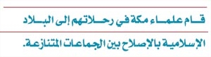 القيام بالوساطة لإيقاف الحرب التي كانت دائرة بين الدولة التركية والمملكة اليمنية في وفد برئاسة العلامة عبد الله بن عباس بن صديق (1270 - 1353هـ): "انتدبه الشريف علي والي مكة المكرمة إلى صنعاء مع هيئة يرأسها من كبار علماء مكة المكرمة للتوسط بين الترك والإمام، فتوفي بصنعاء وكان من أعضاء الوفد العلامة الشيخ علي بن محمد سعيد بابصيل (1273 - 1353 هـ): رافق والده في الهيئة العلمية. سنة 1325 هـ للتوسط.. لإيقاف القتال، وإزالة سوء التفاهم بينهما. يقول الشيخ عمر عبد الجبار رحمه الله: "حدثني أحد أعضاء هذه الهيئة وهو الشيخ محمد فاضل كابلي المتوفى عام 1375هـ بقوله: رافقت الهيئة - يا ولدي - وكان رئيسها الشيخ عبد الله بن صديق مفتي الأحناف ابن الشيخ عباس بن صديق مفتي أحناف عصره، ومن أعضائها الشيخ محمد صالح كمال، والشيخ محمد سعيد بابصيل، وولده الشيخ علي بابصيل، والشيخ عمر باجنيد، والشيخ جعفر لبني، فلما وصلنا صنعاء سمح لنا قائد الجيش التركي بالمرور، فكتبنا للإمام يحيى نشعره بمهمتنا، فبعث وفداً من كبار علماء اليمن لاستقبالنا، فلما وصلنا القصر الملكي خف الإمام فعانق كل واحد منا وهو يقول: مرحباً بعلماء بيت الله الحرام (مرحباً بوفد مهبط الوحي والنور، مرحباً بوفد أقدس البلدان، مرحباً برسل السلام، أهلاً وسهلاً بكم في بلادكم، والله ما (نشتي) للنزاع، (ولا نشتي) سفك الدماء إنما (نشتي) دين الله، وإقامة حدود الله. فكان في كلامه جواب لمهمتنا، إذ ألمح فيه عن أسباب قتاله للترك، ولكن الهيئة رأت أن تكتب له ليكون جوابه مستنداً في مخابراتها مع أمير مكة الشريف علي بن عبد الله، فأجابهم رحمه الله ورحمهم...." يعلق الأستاذ عمر عبد الجبار على هذه القصة قائلاً: "هذه قصة إن دلت على شيء فإنما تدل على نشاط علماء العهد الماضي، واشتراكهم في جميع الميادين غير مبالين بمشاق الأسفار إلى بلاد بعيدة، حيث لا توجد في عصرهم من وسائل النقل غير الجمال، والبغال، والحمير، رائدهم الإصلاح، وفض النزاع بين المسلمين، توحيداً لكلمتهم، وجمعاً لشملهم". ومن المهام التي قام بها علماء مكة العالمة في رحلاتهم: ما يذكر عن السيد عباس ابن عبد العزيز المالكي (1270 - 1353هـ) انتدبه الشريف حسين بن علي إلى الحبشة لبناء مسجد للمسلمين فيها، ثم إلى بيت المقدس لبناء قبة الصخرة والمسجد الأقصى، وحمل معه الأموال التي تجمعت من الاكتتاب لهذا الغرض" هذه نبذة موجزة عن بعض النتائج لرحلات علماء مكة العالمة في القرن الرابع عشر الهجري استشهاداً، وتمثيلاً وليست استقصاء، تصب جميعها في خدمة الإسلام والمسلمين، فمن ثم استحقوا الدعاء بالرحمة، والرضوان، والثناء الجميل من الأجيال اللاحقة.