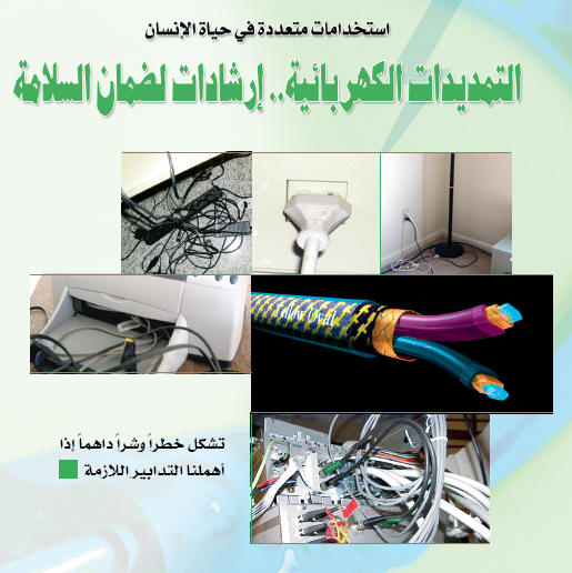 ومن الجدير بالتنويه أن التمديدات الكهربائية تشكل عنصراً مهماً في سلامة الإنسان والمعدات ضد أخطار الصدمات الكهربائية والصواعق وحدوث الحرائق التي تودي بالحياة والممتلكات (لاقدر الله)، ومن هذا المنطلق يستلزم الأمر اتخاذ تدابير الوقاية والأمان عند عمل التمديدات الكهربائية أو حين التعــامل مع الأجهــــــزة والمصابيح الكهربائية التي تتمثل فيما يلي: 1- استخدام الموصلات والكابلات ذات المقاطع المناسبة مع استخدام المصهرات والقواطع الآلية للحماية ضد الزيادة غير الطبيعية في التيارات المارة في تلك الموصلات والكابلات المغذية للأجهزة والمصابيح الكهربائية. 2- عدم استخدام الأجهزة والمصابيح الكهربائية عند جهد كهربائي أعلى من الجهد المقتن لها (تشغيل جهاز 127 فولت عند 220 فولت مثلاً) لأن هذا يؤدي إلى ارتفاع التيار المار في دوائر الجهاز أو (المصباح) وبالتالي يؤدي إلى ارتفاع شديد في درجة الحرارة. 3- التأكد من توصل الدائرة الكهربائية للمصباح بالطريقة الصحيحة وباستعمال المواد المنصوص عليها في المواصفات القياسية لعمل العوازل وأطراف التوصيل للمصباح. 4- استعمال مصهرات (فيوز) ذات مواصفات قياسية وعدم استخدام مصهرات ذات سعة أكبر من المنصوص عليها لأن ذلك يسمح بمرور تيارات كهربائية عالية نسبياً بدون فصل الدائرة الكهربائية للمنزل مما يؤدي إلى سخونة الأسلاك وتهتك عازليتها وتسرب تياراتها وبالتالي حدوث الصعقات والحرائق. 5- تركيب أنظمة الإنذار من الحريق والتي تعمل عند ارتفاع درجة الحرارة عن حد معين أو عند استشعارها بوجود دخان في الوسط المحيط بها، ومن الجدير بالذكر أن كثيراً من الدول المتقدمة تقوم بإلزام مواطنيها بتركيب مثل هذه الأنظمة لحماية الأشخاص والمعدات والممتلكات. 6- حماية الأبنية من الصواعق الجوية وذلك بتركيب أجهزة مصممة لذلك عبارة عن مجموعة مؤلفة من مانعات الصواعق (Lightningattestors) توضع في الأماكن العليا من المباني وهي محمولة على حامل معدني مثبت جيداً وبطول مناسب يتم توصيلها إلى مآخذ أرضية مستقلة عن المآخذ الأرضية الخاصة بالشبكات الكهربائية.