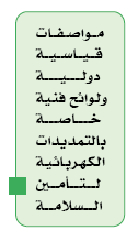 تنـــــص المواصفات القياسية السعودية المتعلقة بالتمديدات واللوائح المرتبــــطة بها على ضرورة اســـــتخدام معدات مطابقة للمواصفات القياسية المعنية خاصة فيما يتعلق بقيمة مقــــاومة العزل والارتفاع في درجة الحرارة ومقـــاومة الرطوبة والغبار، كما توضـــح المواصفات القياسية الحد الأعلى لقيمة التيار التســـرب المســــموح به في الأجهزة الذي يعكــــس جودة المواد العـــازلة وقدرتها على تأمين السلامة من الصدمة الكهربائية.