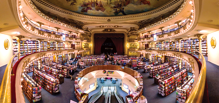تنتشر هذه المكتبات في أنحاء العالم، فتقع إحداها في العاصمة الأرجنتينية بوينس آيرس، إذ قام المهندس المعماري فيرناندو مانزون بتحويل مسرح سابق بني في عام 1919 إلى مكتبة كبيرة باسم إل أتينيو جراند سبليندد، تعرض الكتب تحت قبة المسرح والسقف المزين بالرسومات التي أبدعها الرسام الإيطالي نازارينو أورلاندي، في حين تطل الكتب من الشرفات المزخرفة التي كانت في الأساس مخصصة للمشاهدين في المسرح.