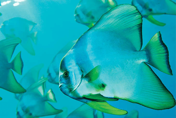 Mukojima, Bonin Islands, Japan: Hunting for morsels of plankton, a school of spadefish hovers near the surface off Japan’s subtropical Bonin Islands. The turquoise color permeates the water late in the afternoon, as the red rays of the setting sun spread out and grow weak.