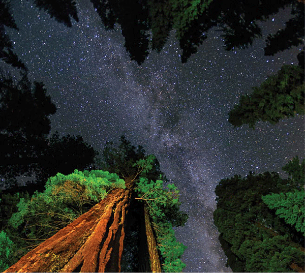 Van Gogh in Yosemite. The Milky Way paints the sky above giant sequoia trees. Given the imperative of seeking resources from sky and soil, and with sufficient time, a tree can become huge and then keep growing. Giant sequoias are gigantic because they are very old — as much as 3,000 years old.